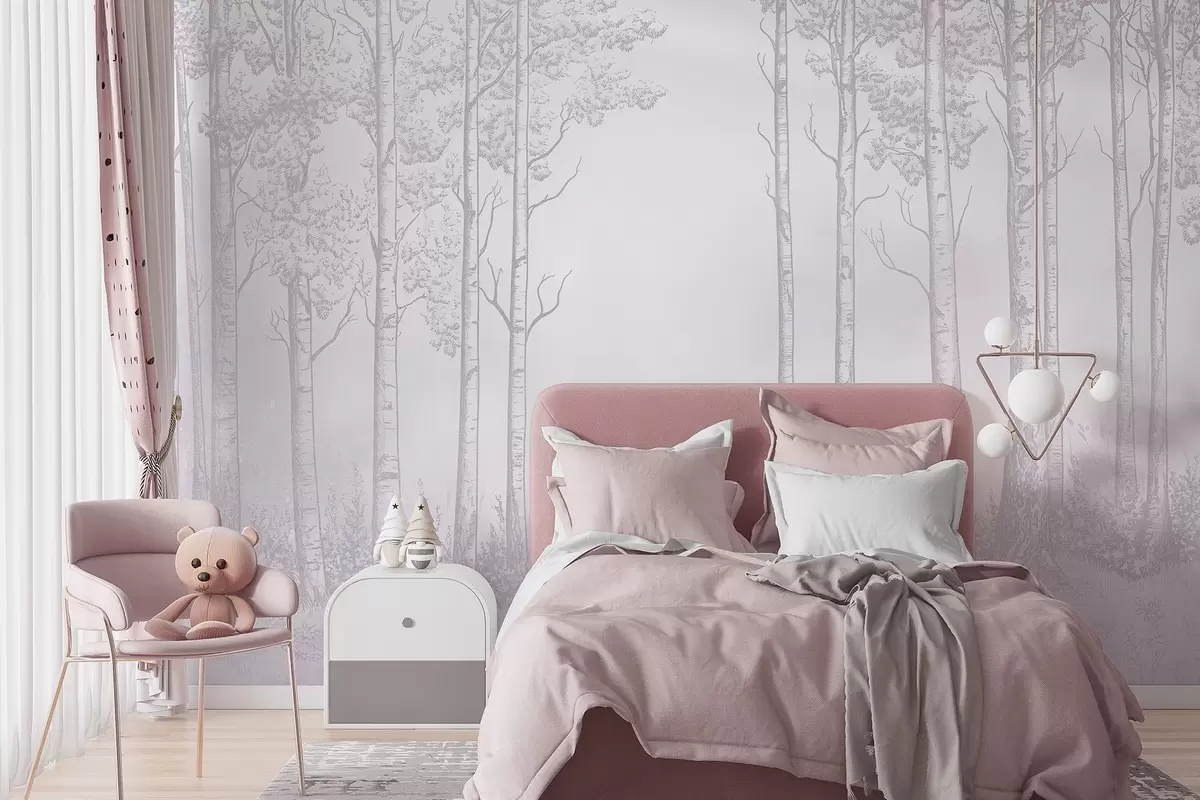 Fotomurales Bosque con abedules, minimalismo, naturaleza, paleta de colores rosa Nr. w04009v2