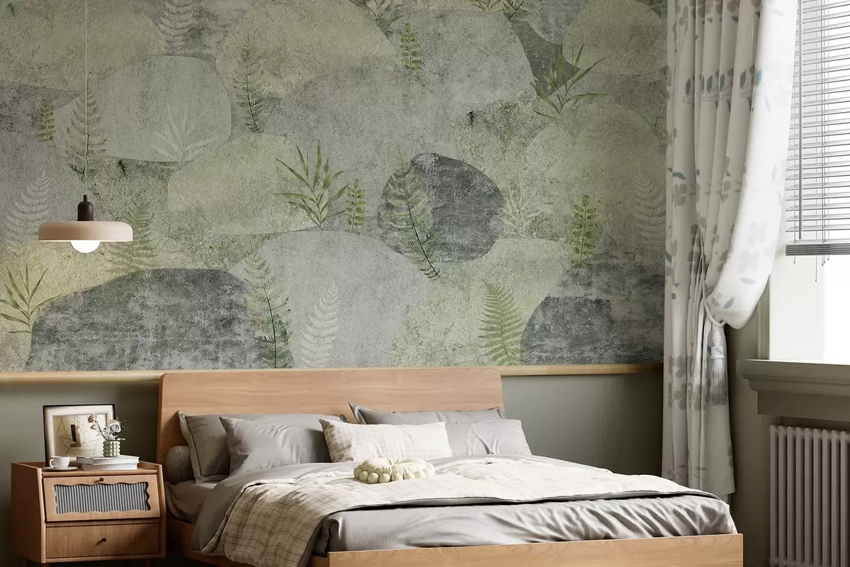 Fotomurales Piedras con plantas, helecho, nórdico, estilo rústico, colores gris y verde Nr. w04064v2