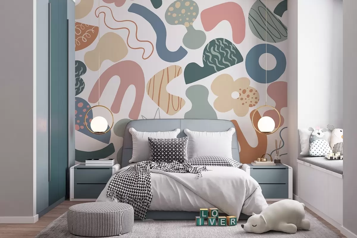 Fotomurales Figuras geométricas con garabatos dibujo, juvenil, verde, rosa, azul Nr. w04068v2