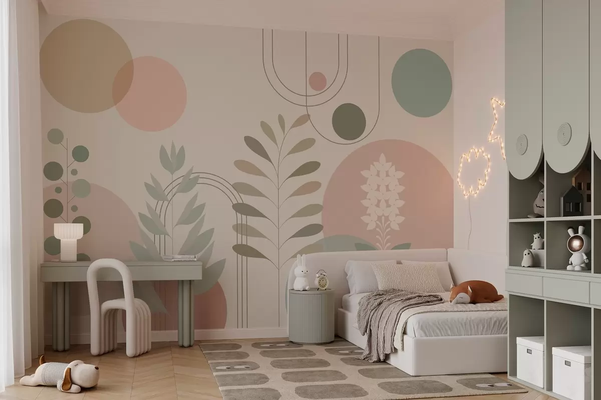 Fotomurales abstracción geométrica con círculos y plantas estilizadas sobre fondo crema Nr. w04070