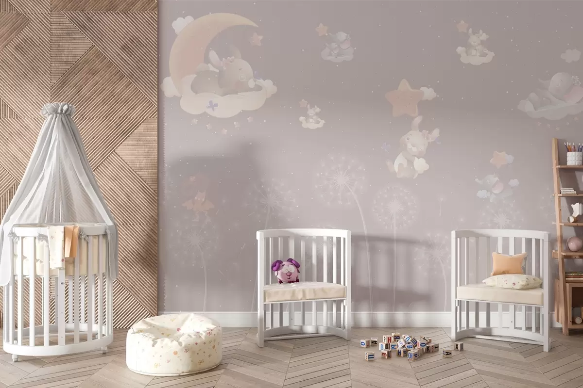 Fotomurales Noche de cuento de hadas con conejo y dientes de león sobre fondo rosa Nr. w04195v2