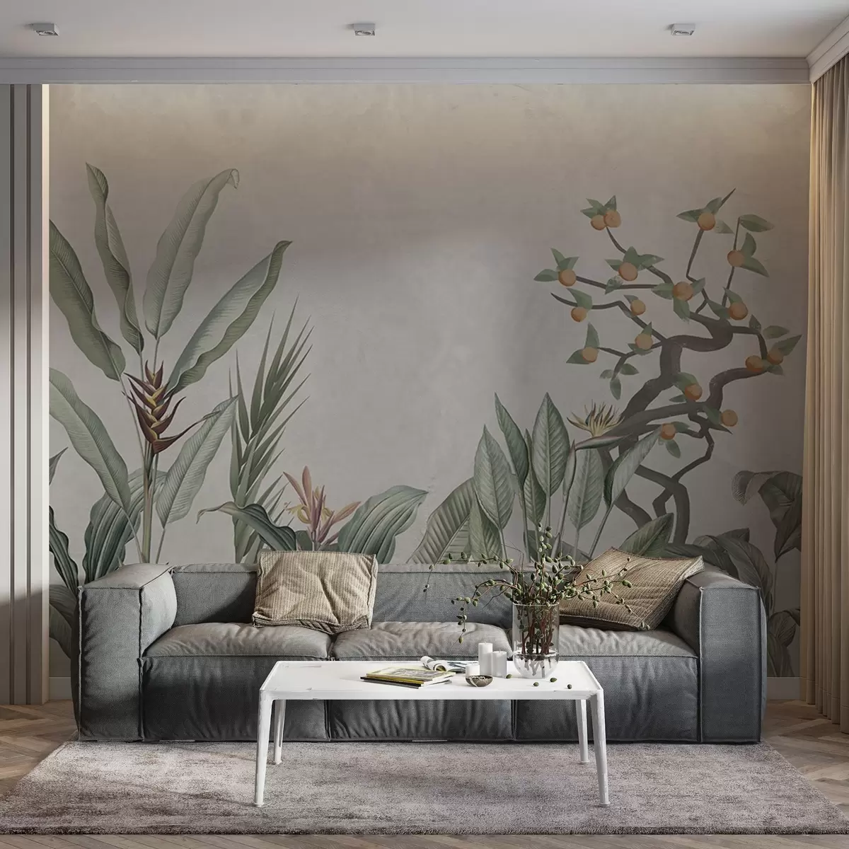 Fotomurales Composición tropical con plantas y árbol sobre fondo grisáceo Nr. w04201v1