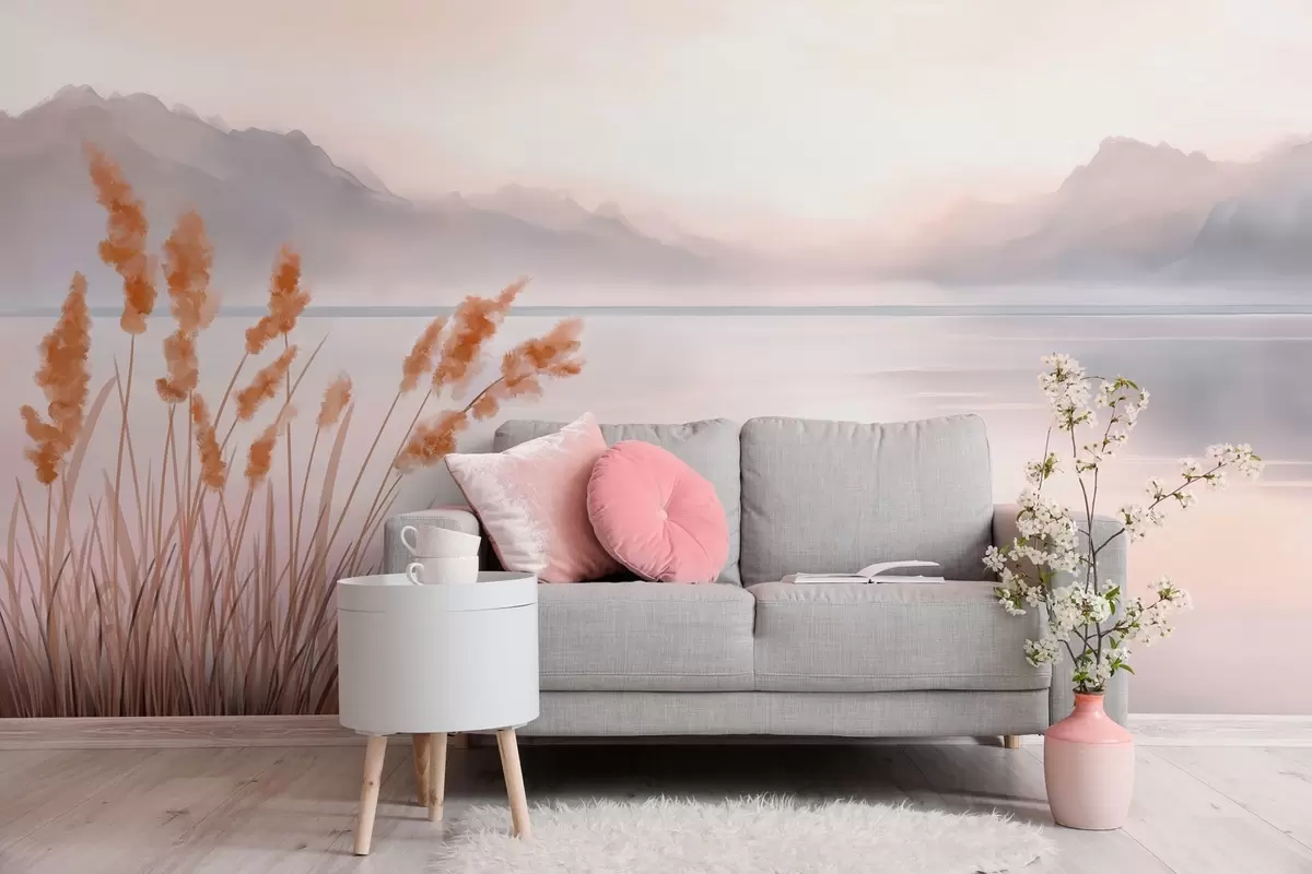 Fotomurales un pintoresco lago con juncos y montañas Nr. w04315