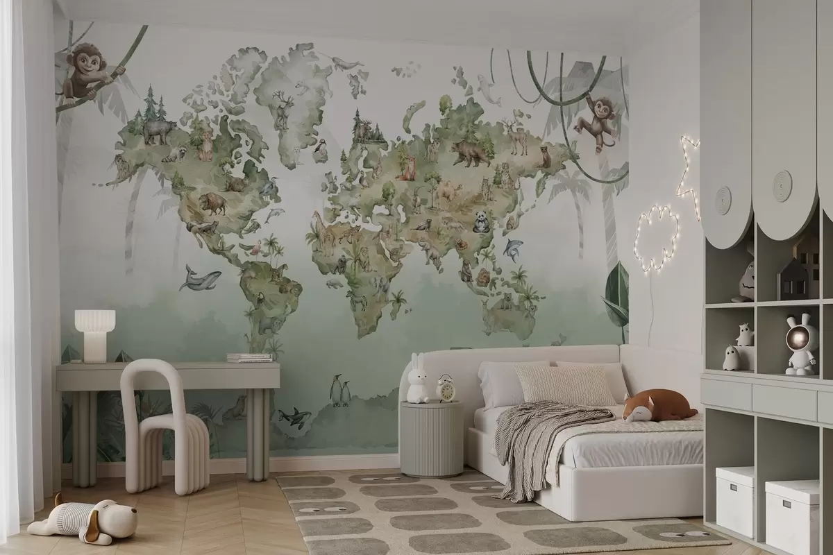 Fotomurales Mapamundi en acuarela con animales Nr. w04418
