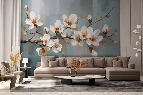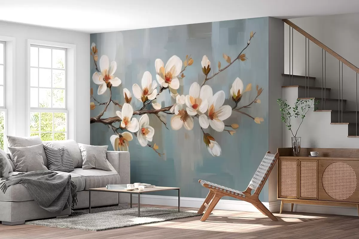 Fotomurales Una rama en flor al estilo de la pintura al óleo sobre fondo azul Nr. w04496