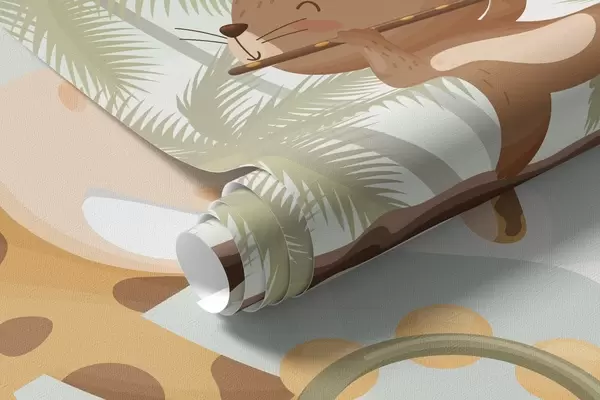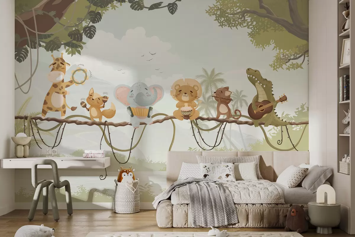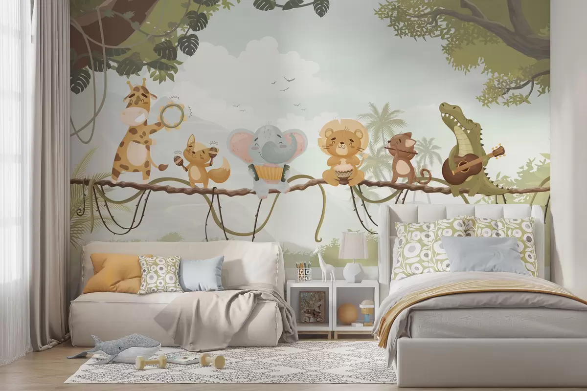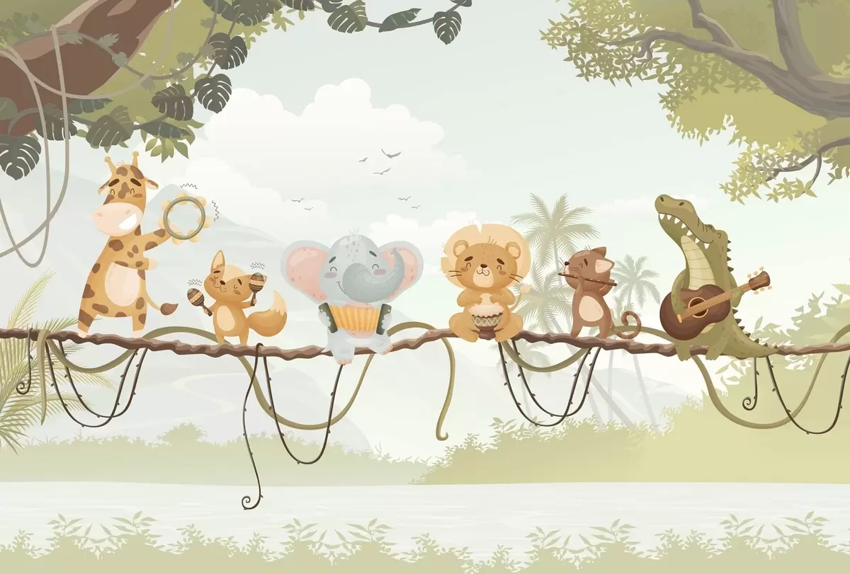 Fotomurales Animales con instrumentos musicales frente a un paisaje tropical. Nr. w04505v1