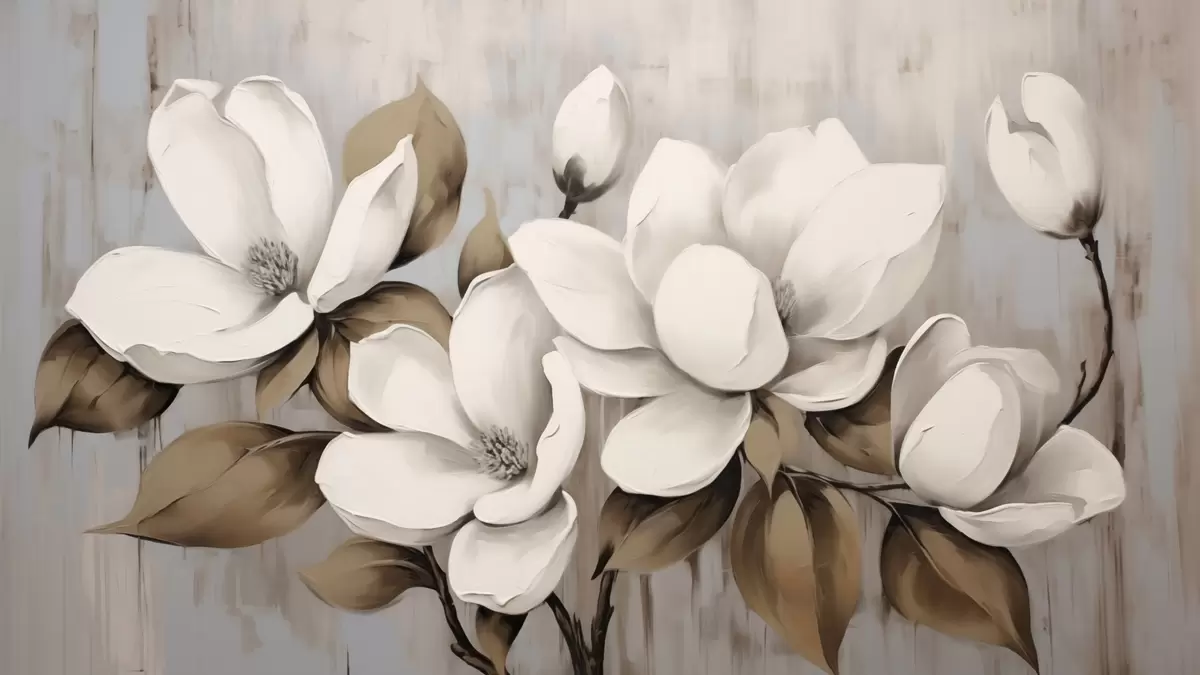 Fotomurales Grandes flores de magnolia con hojas de color topo sobre fondo cepillado. Nr. w04785