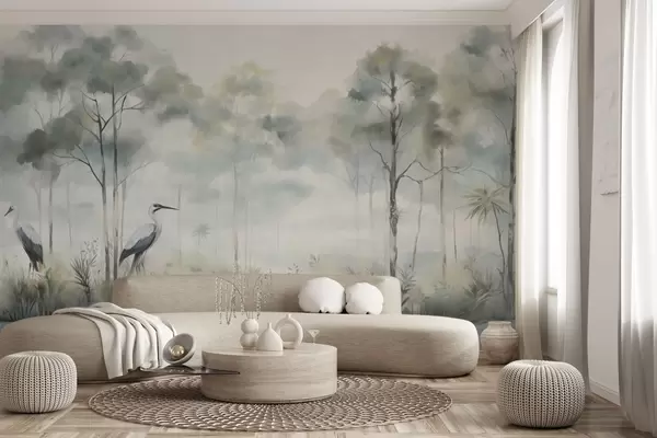 Fotomurales Bosque brumoso junto al agua con garzas, paleta de colores suaves y fríos. Nr. w04788