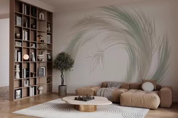 Fotomurales Plumas y flores verdes y beige, pintadas a mano. Nr. w04816