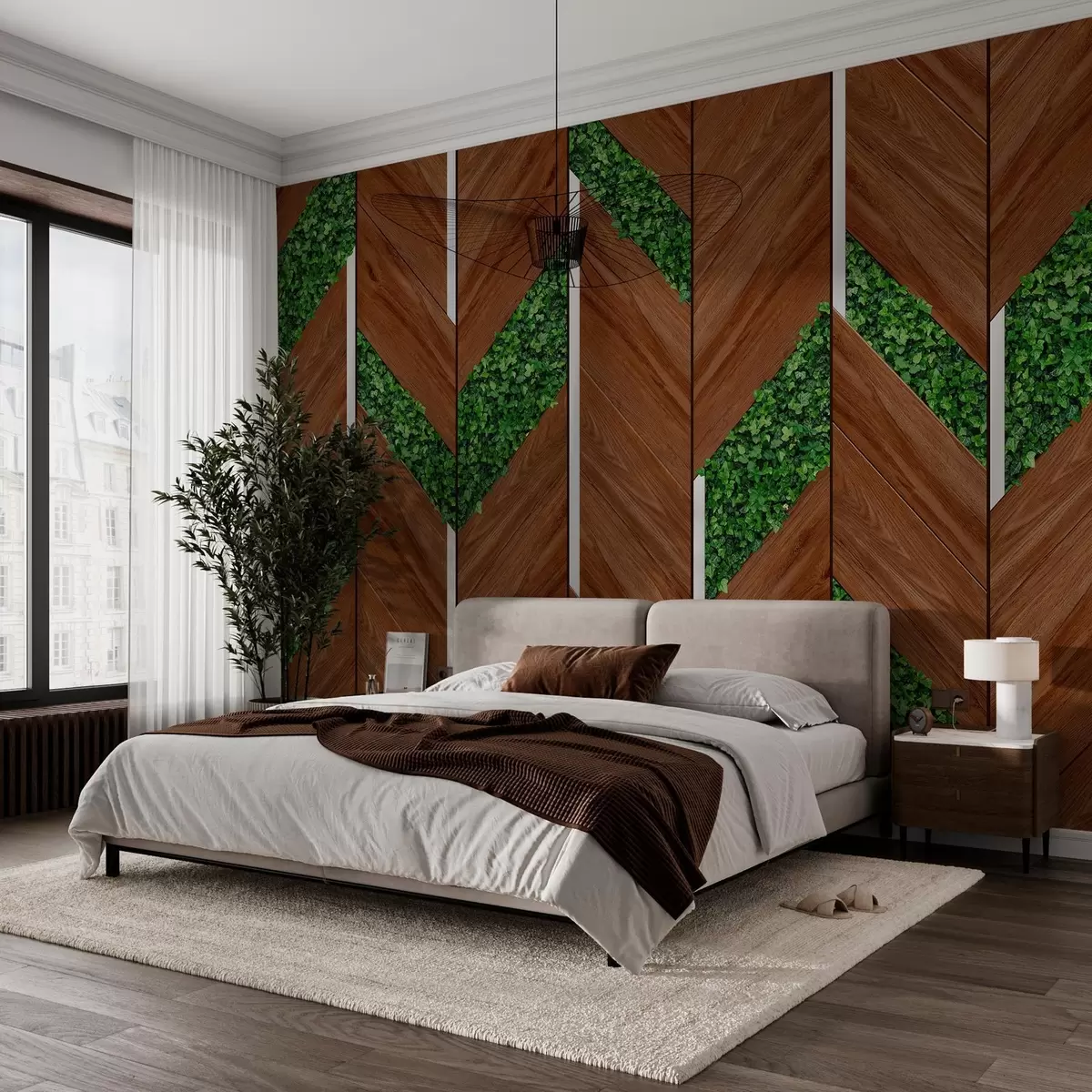 Fotomurales imitación de paneles de madera oscura con inserciones vegetales Nr. w04875v1