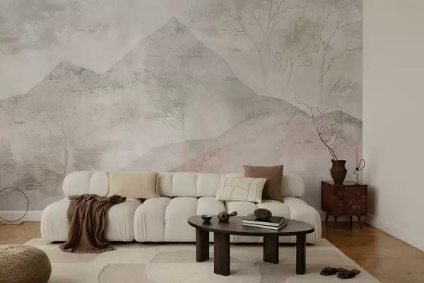 Fotomurales Montañas y árboles en tonos pastel suaves envueltos en una ligera niebla. Nr. w04954