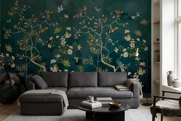 Fotomurales Escena decorativa con árboles, flores y pájaros sobre fondo oscuro. Nr. w05004