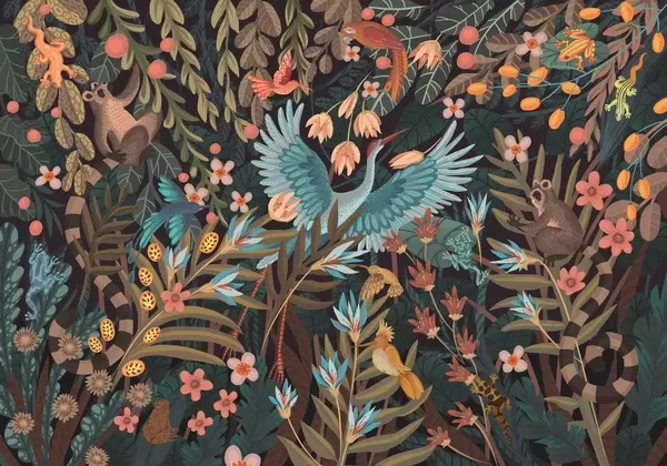 Fotomurales Escena fantástica con pájaros y animales entre plantas Nr. w05024