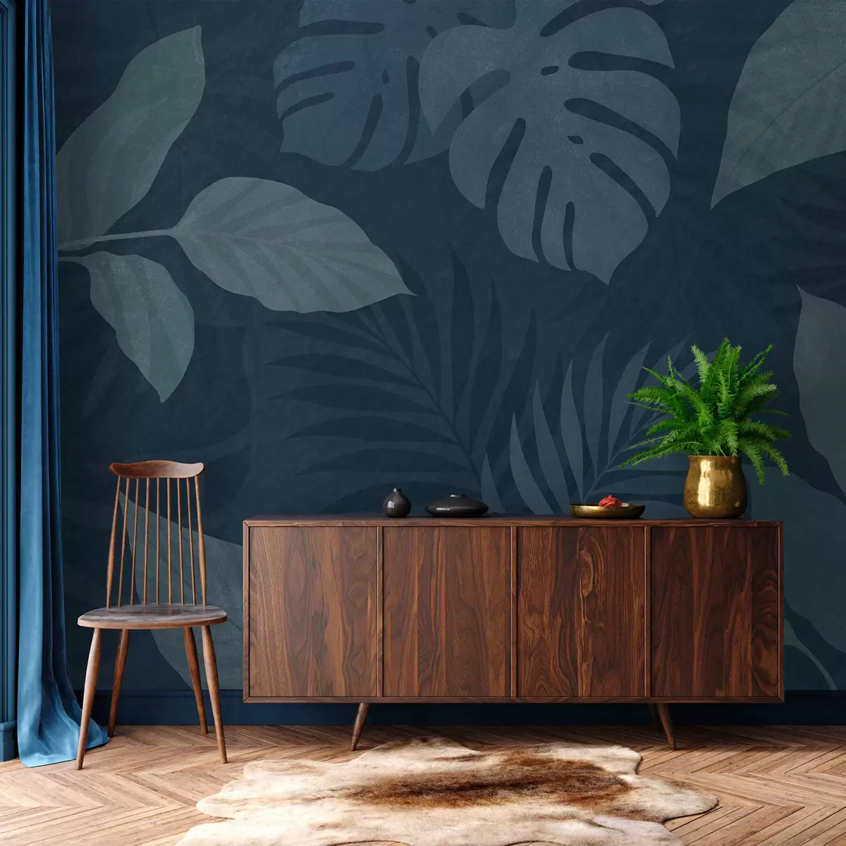 Fotomurales hojas tropicales texturizadas sobre un fondo azul oscuro Nr. w05063v3
