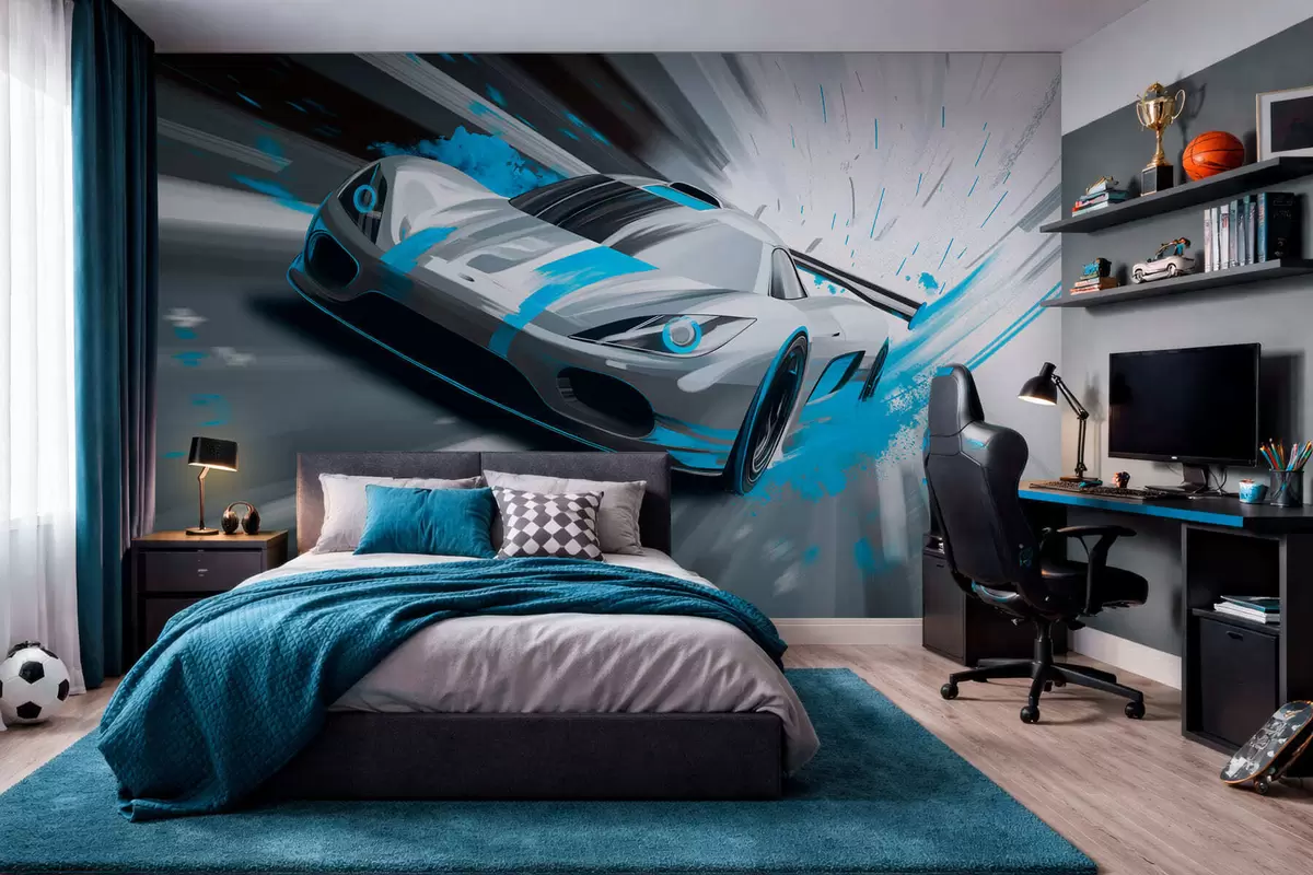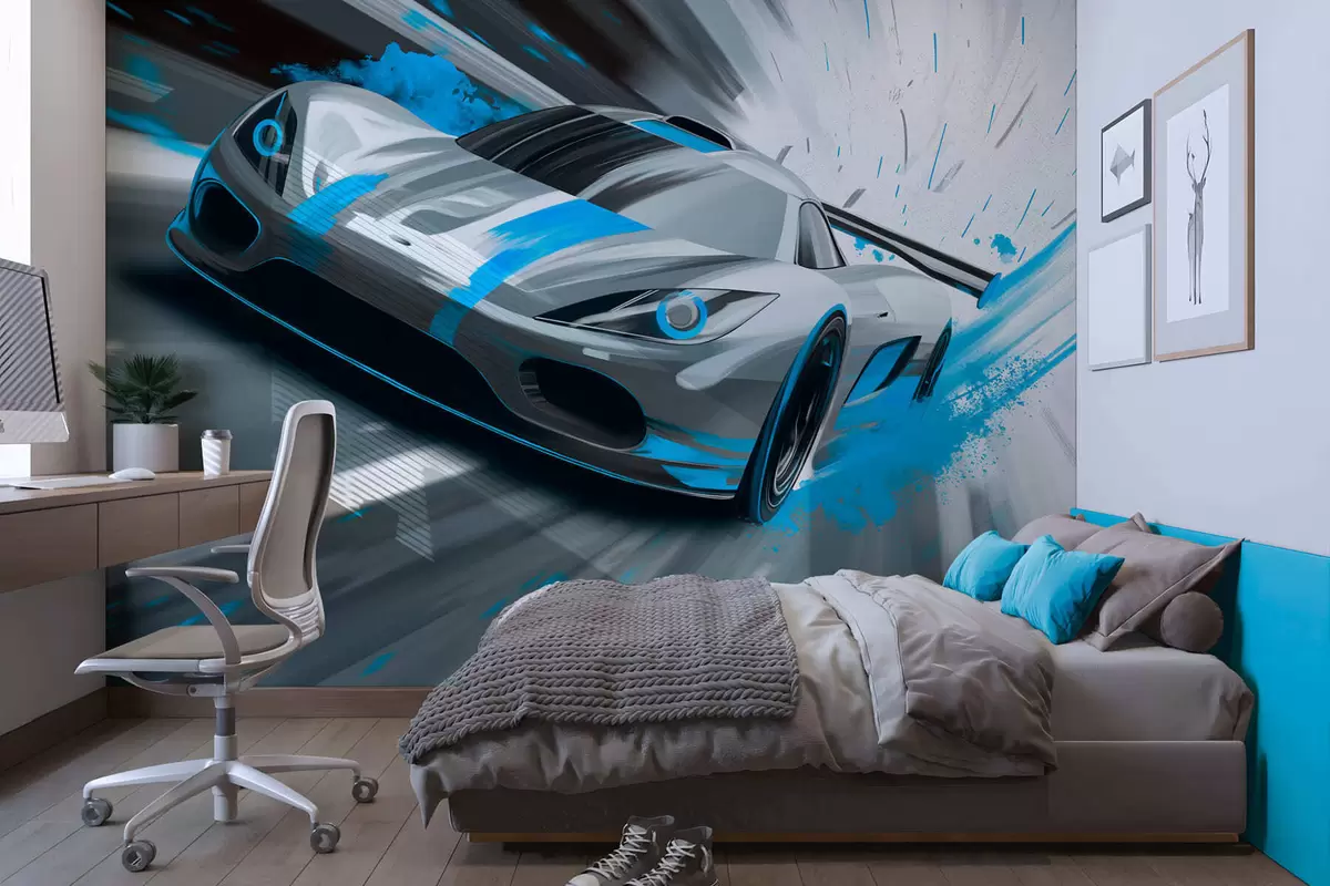 Fotomurales Coche deportivo dinámico con estilo de dibujo digital y detalles en turquesa. Nr. w05069v3