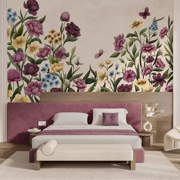 Fotomurales Composición floral con plantas y mariposas sobre fondo claro. Nr. w05072