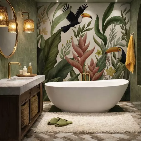 Fotomurales Plantas tropicales y aves de pico grande sobre fondo claro Nr. w05088v1