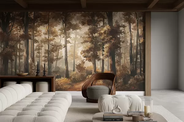 murales de pared Escena otoñal en el bosque con luz cálida y árboles densos. w05089v1