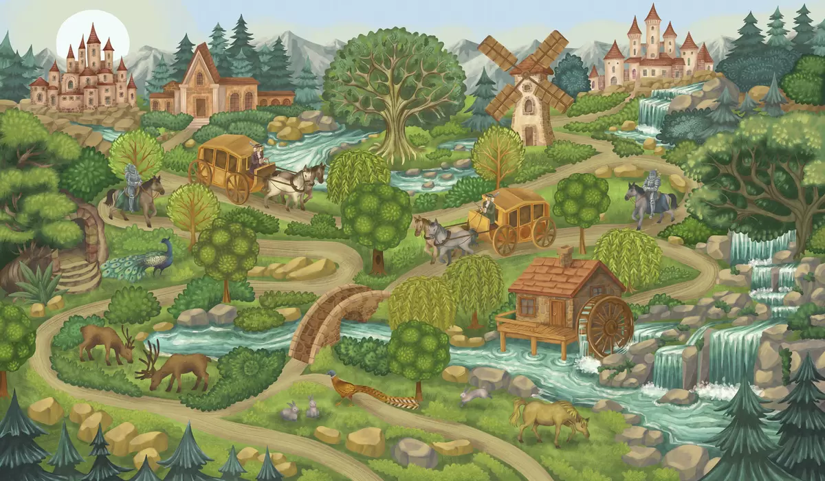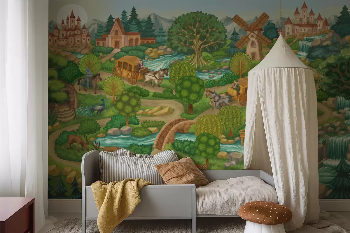 Fotomurales Ilustración de hadas con castillos, bosques, ríos y viajeros. Nr. w05091v1