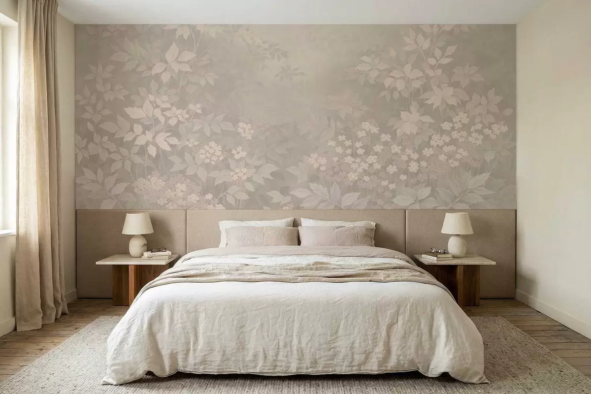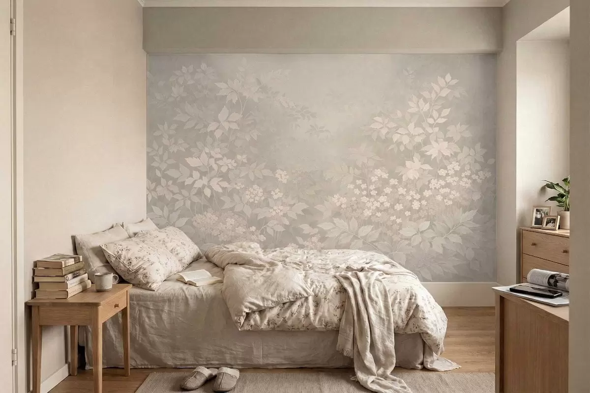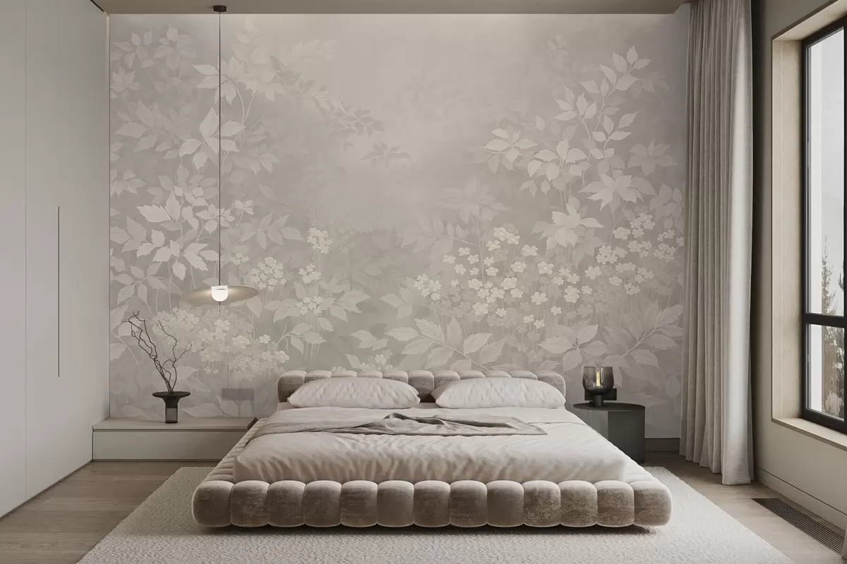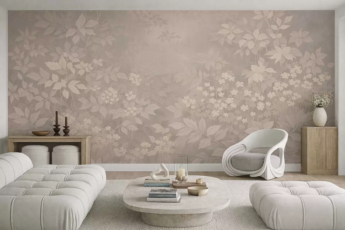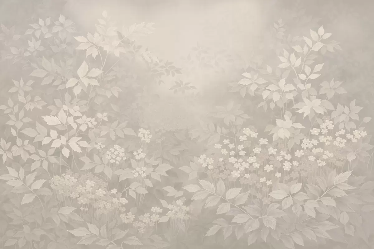 Fotomurales Suave estampado botánico con hojas y flores en la niebla. Nr. w05115v1