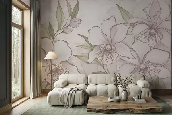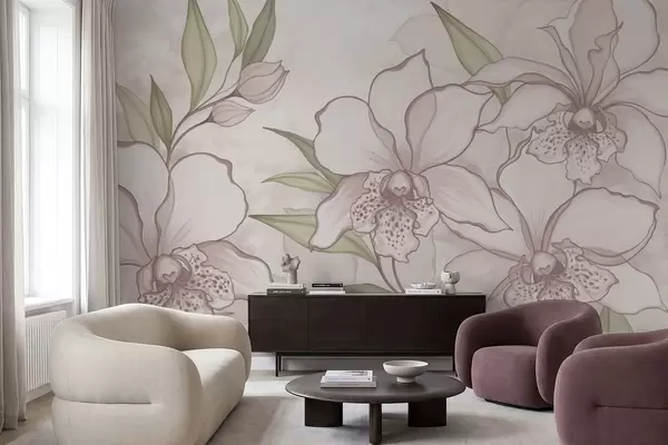 Fotomurales Ilustración de orquídeas pálidas con hojas sobre fondo beige. Nr. w05117