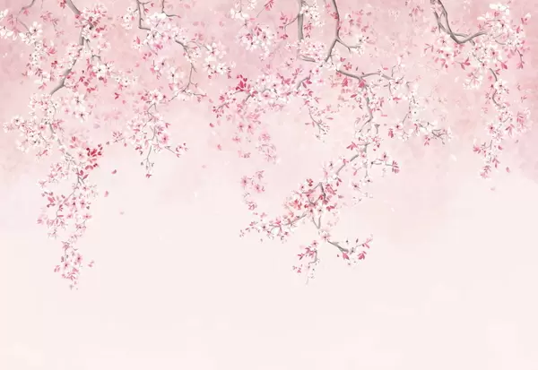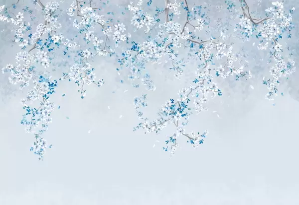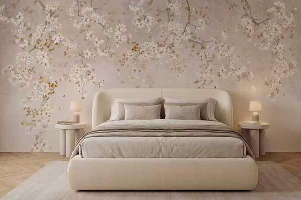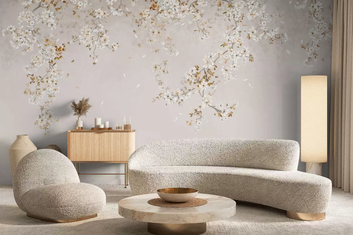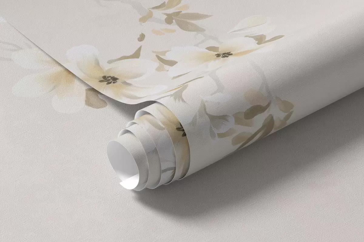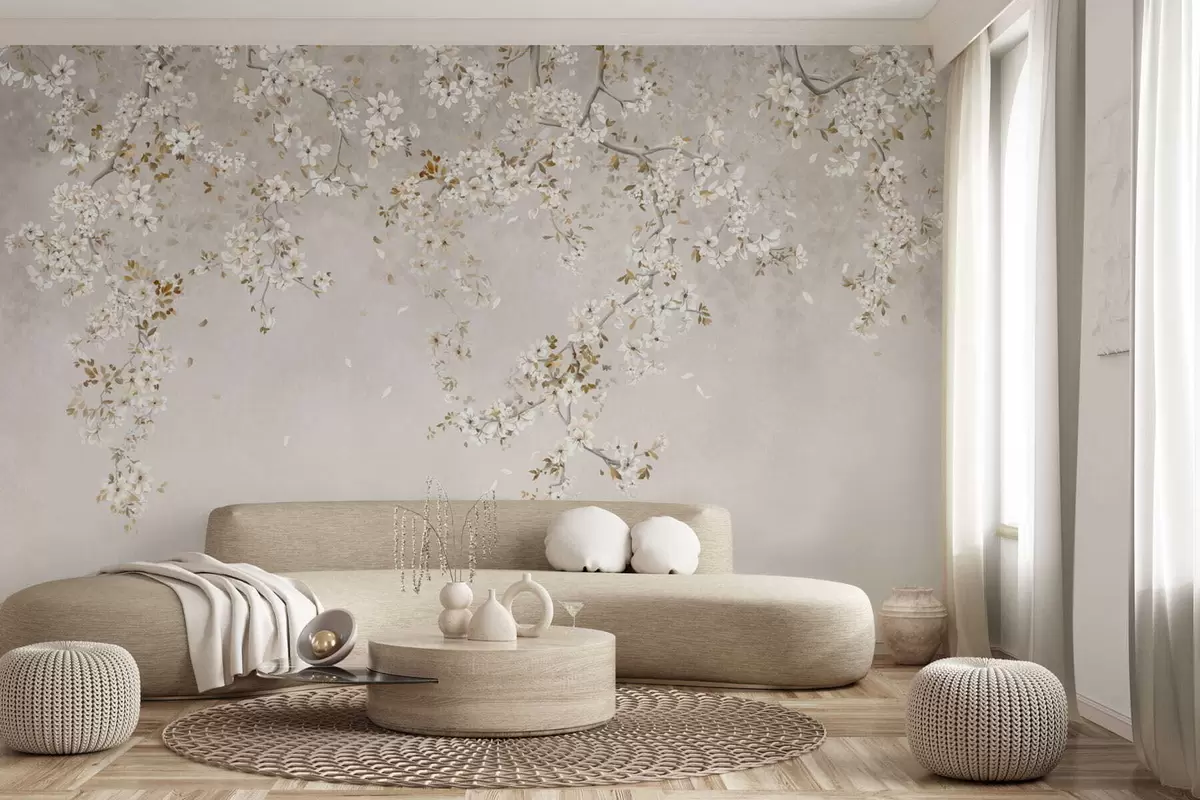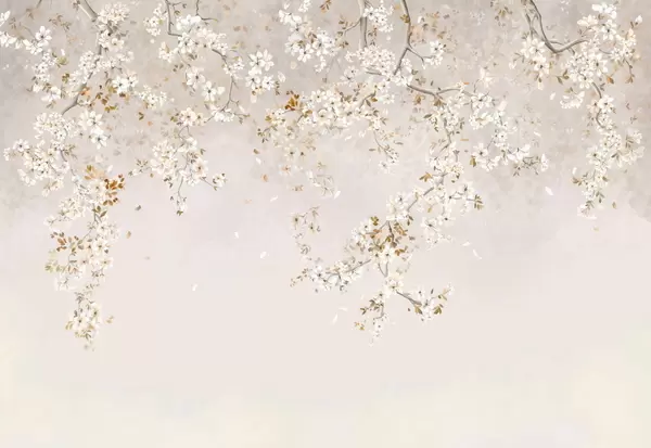 Fotomurales Ramas con flores blancas sobre un fondo beige suave. Nr. w05129