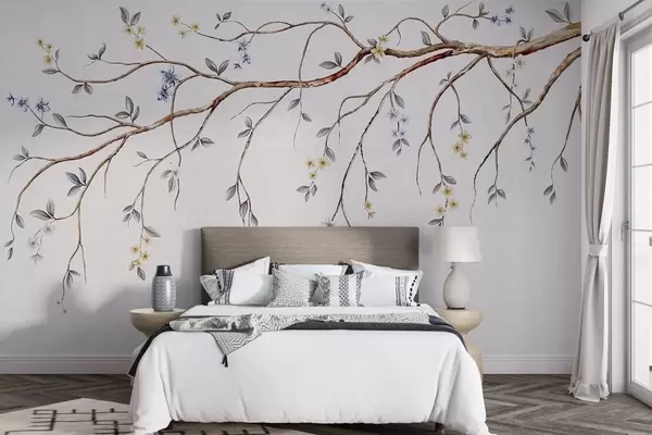 Fotomurales Ramas delgadas con pequeñas flores sobre fondo claro. Nr. w05145