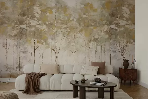 Fotomurales Bosque estilizado con árboles esbeltos en tonos cálidos. Nr. w05221