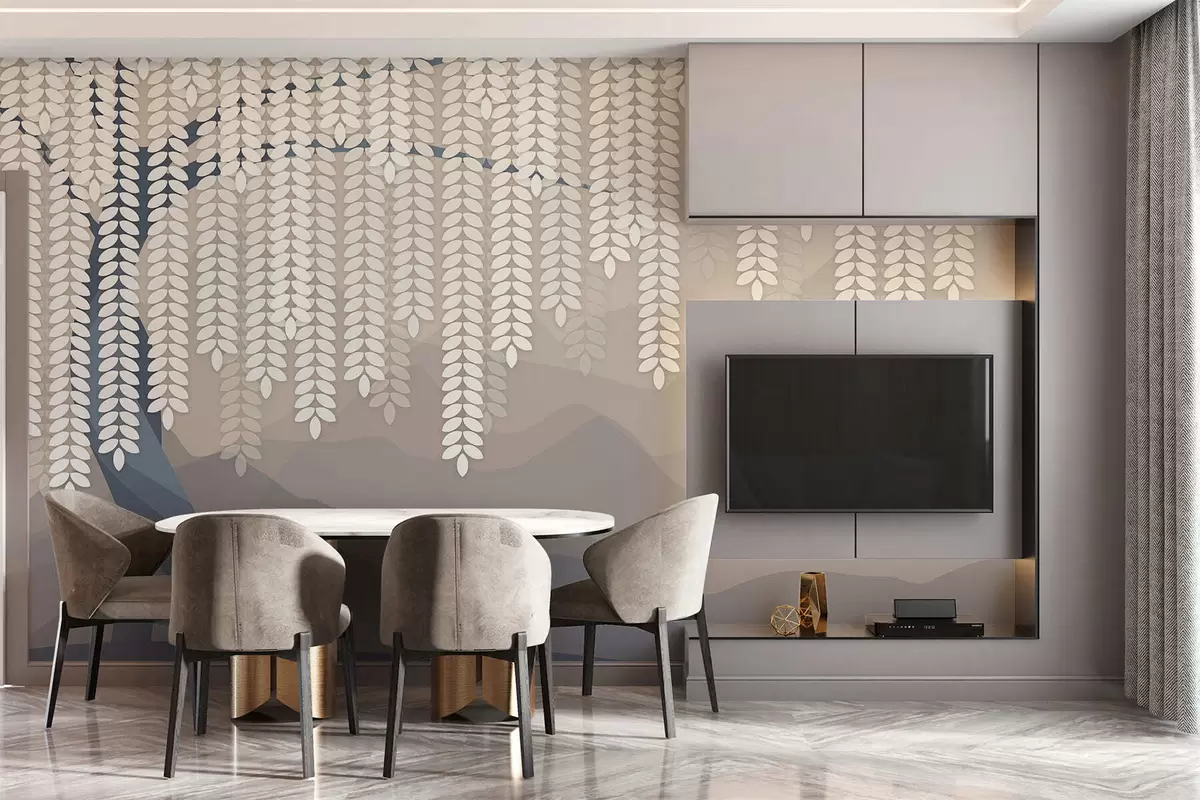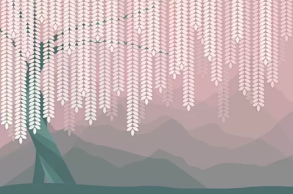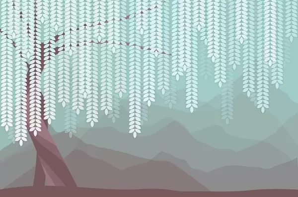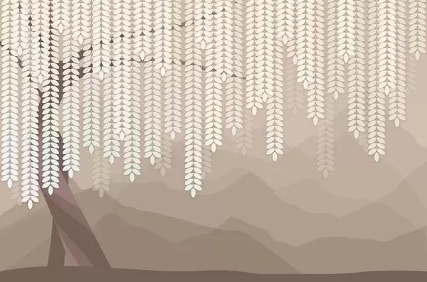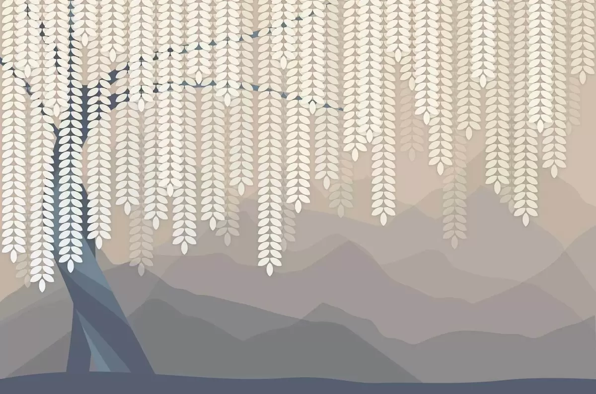 murales de pared Sauce estilizado con hojas colgantes sobre un fondo de montañas minimalistas en tonos beige y azul verdoso. w05232