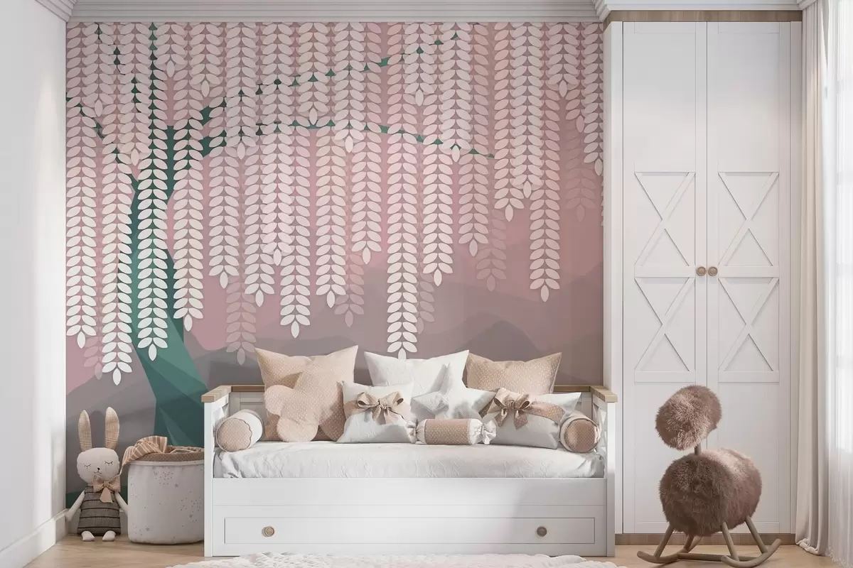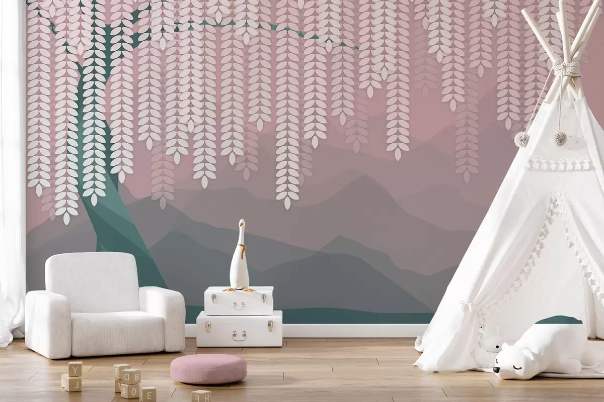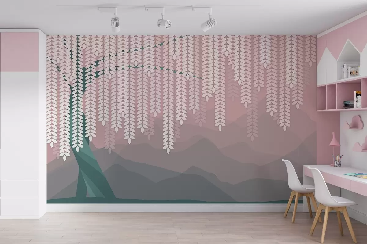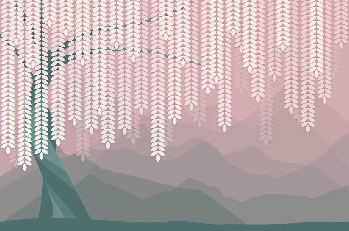 Fotomurales Árbol de sauce estilizado con hojas colgantes sobre un fondo de montañas minimalistas en tonos rosa y verde oscuro. Nr. w05232v4