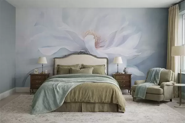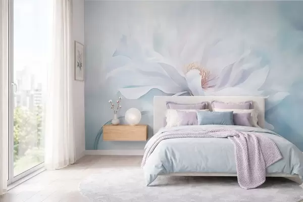 Fotomurales Flor blanca suave con pétalos fluidos sobre fondo azul. Nr. w05354