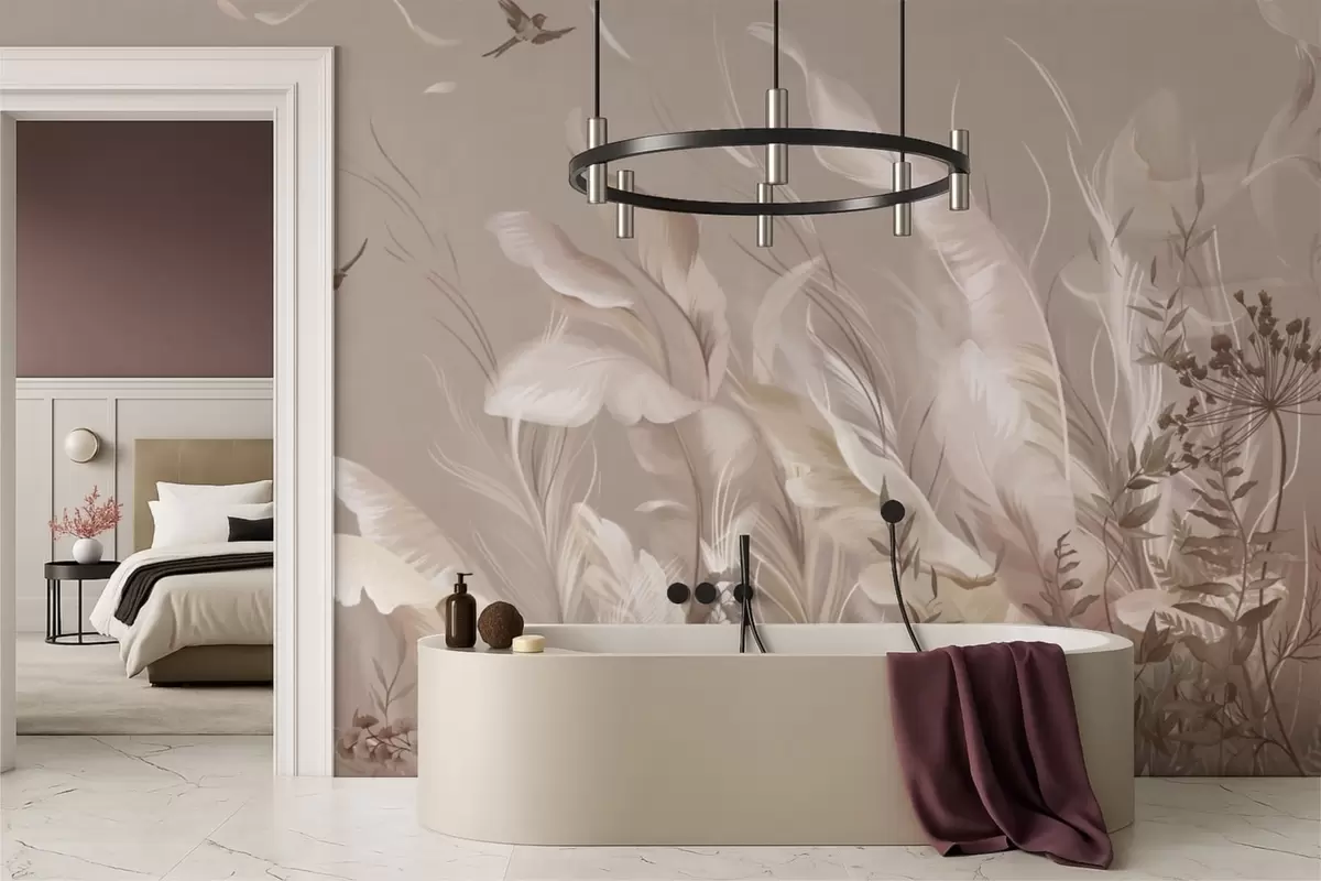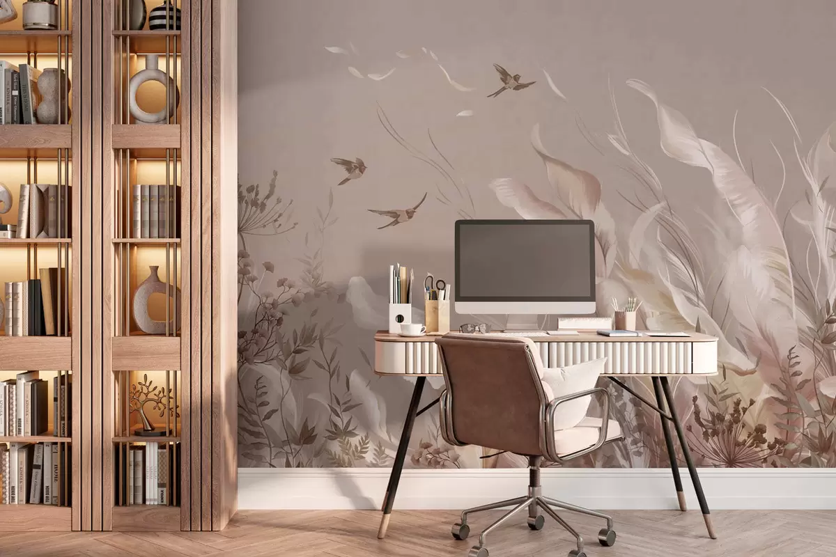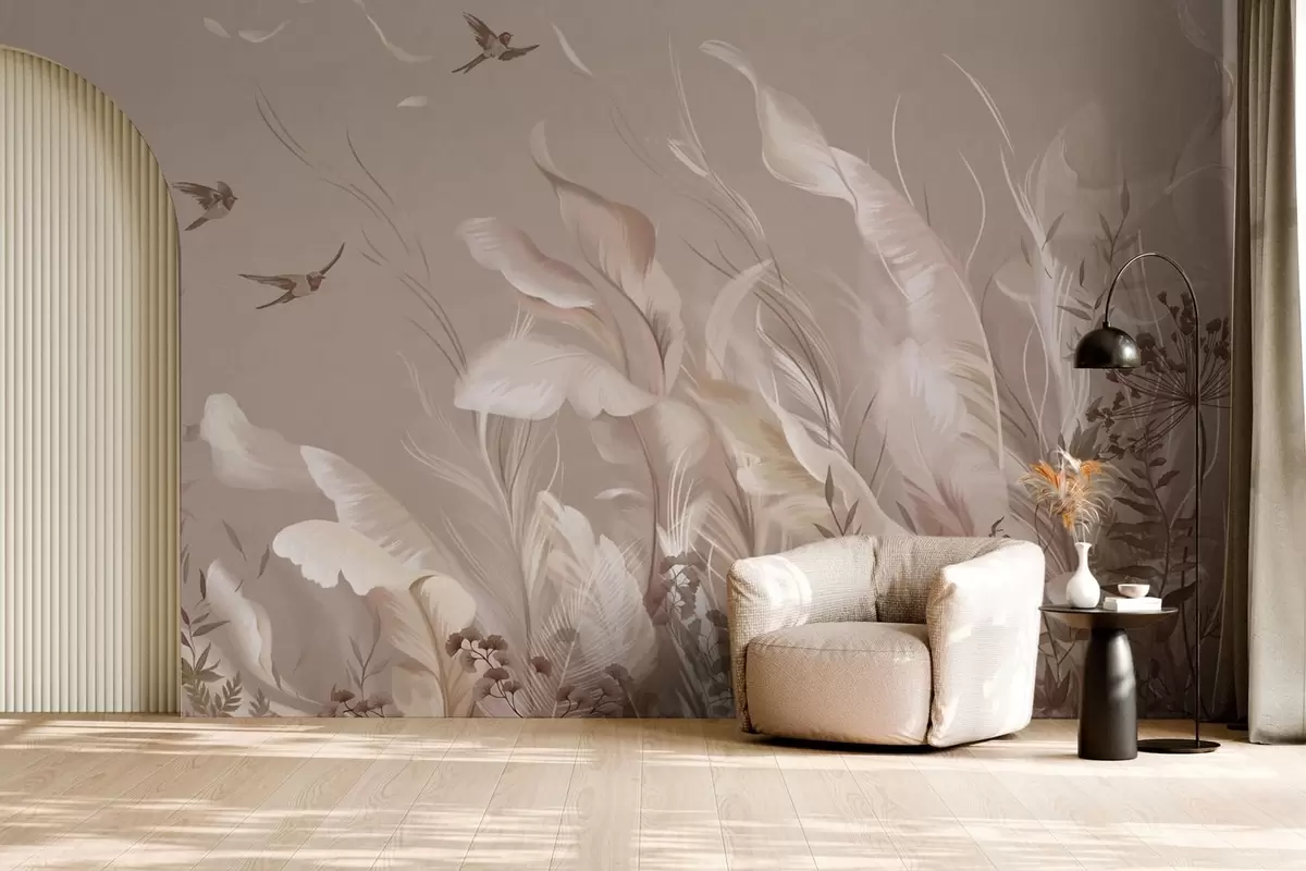 Fotomurales Plumas y plantas ligeras con pájaros en tonos pastel Nr. w05395v1
