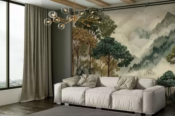 Fotomurales Bosque con árboles altos en montañas envueltas en niebla Nr. w05410