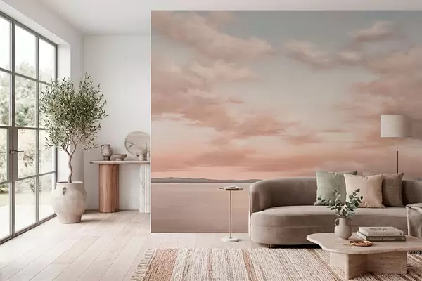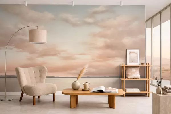 murales de pared Horizonte marino minimalista con nubes en tonos pastel w05516