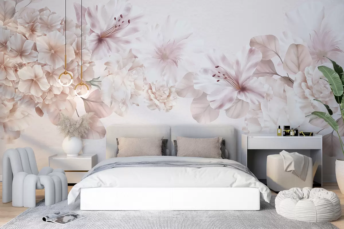 Fotomurales Arreglo floral rosa suave y blanco, con delicados pétalos y flores sobre un fondo claro Nr. w07923