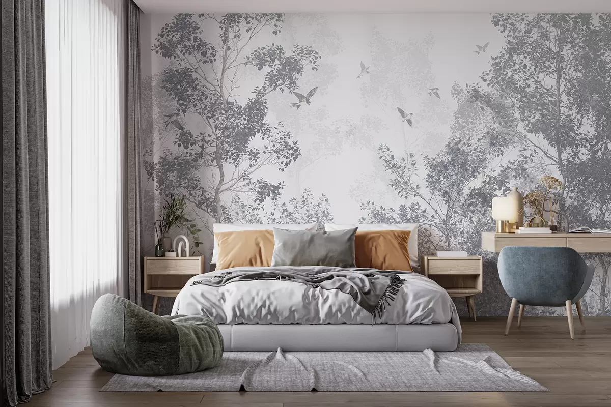 Fotomurales Árboles con hojas y ramas grises con pájaros volando en el cielo, fondo blanco Nr. w07982v1