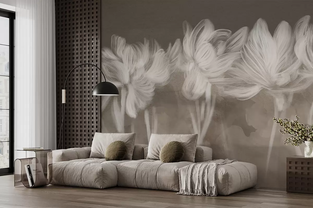 Fotomurales Suave minimalismo siluetas florales blancas transparentes sobre fondo de textura marrón Nr. w07986