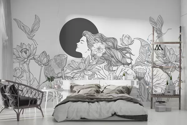 Fotomurales Mujer en la naturaleza, dibujo lineal, flores de loto, hojas grandes, pájaros voladores, color gris Nr. w07988v2