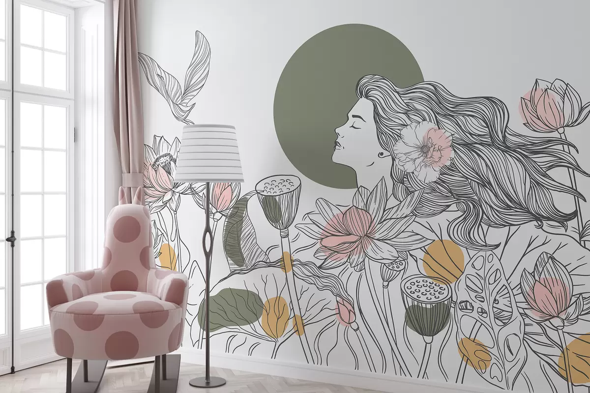 Fotomurales Mujer en la naturaleza, dibujo lineal, flores de loto, hojas grandes, pájaros voladores, colores pastel Nr. w07988v6