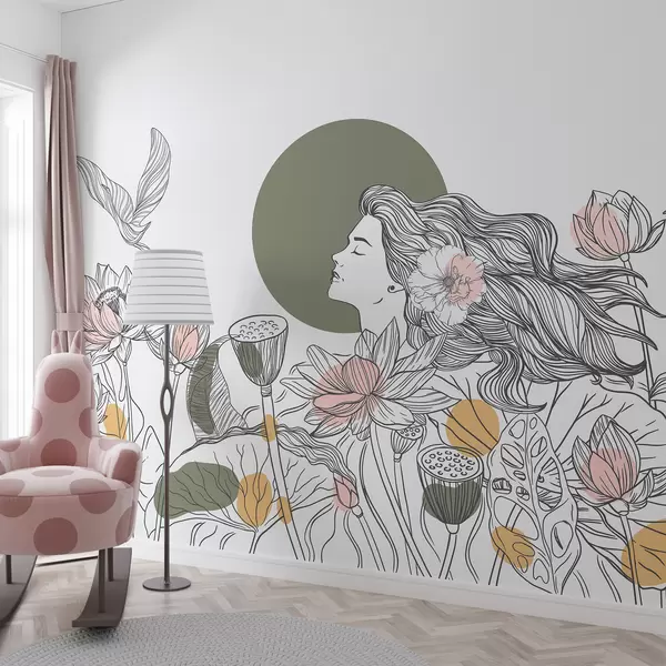 Fotomurales Mujer en la naturaleza, dibujo lineal, flores de loto, hojas grandes, pájaros voladores, colores pastel Nr. w07988v6