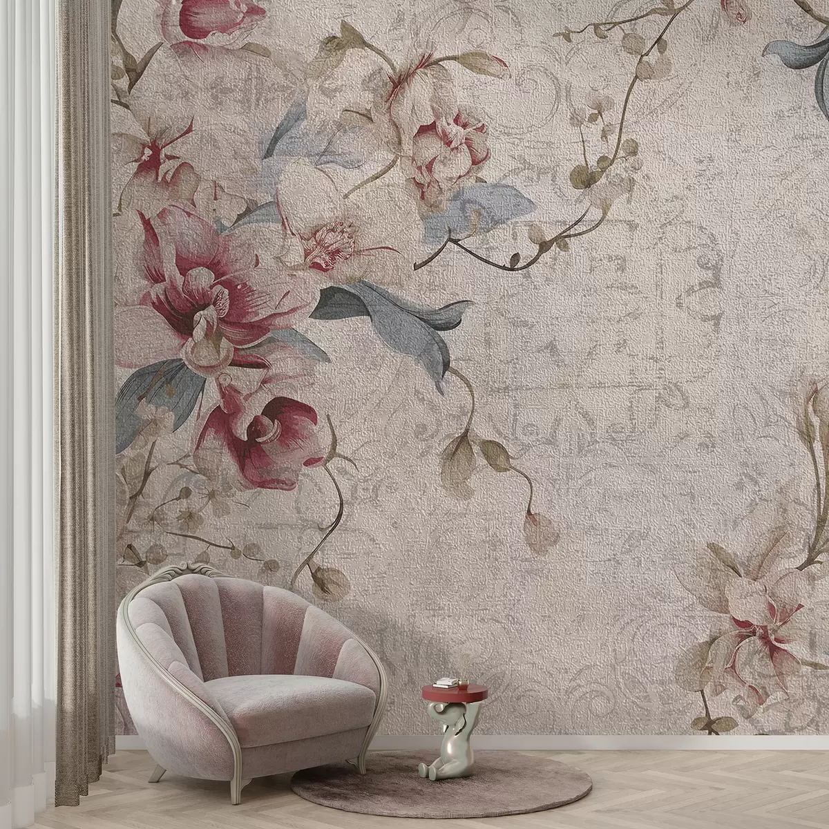 Fotomurales Un patrón floral vintage con delicadas flores rosas y blancas, hojas sobre un fondo beige claro. Nr. w08149