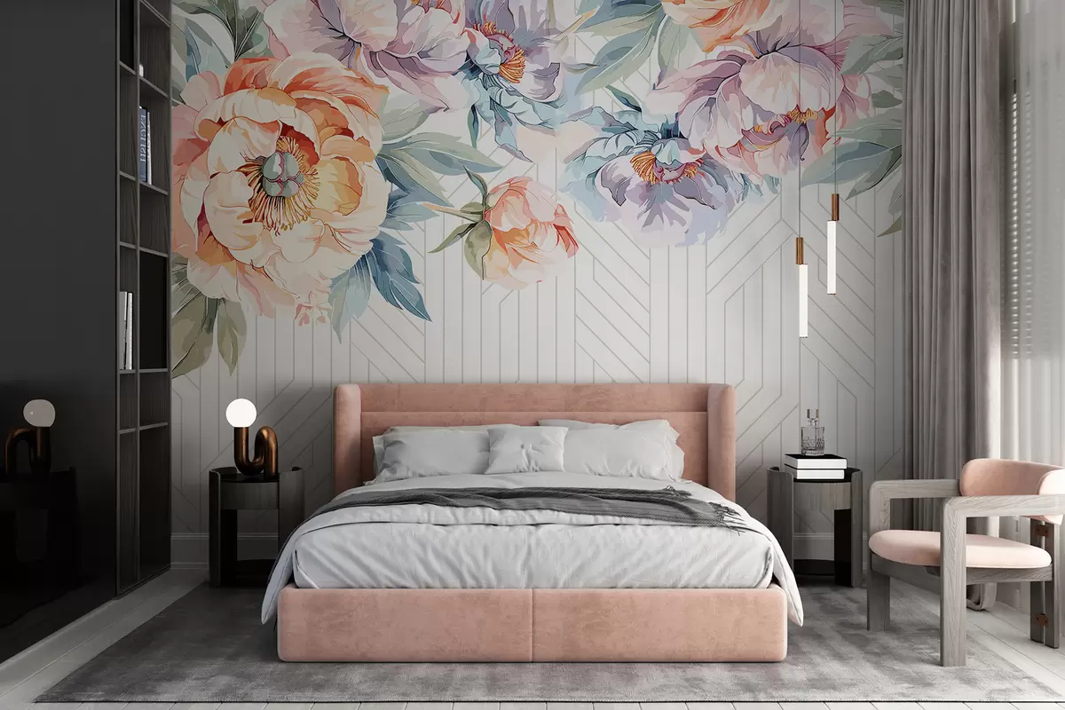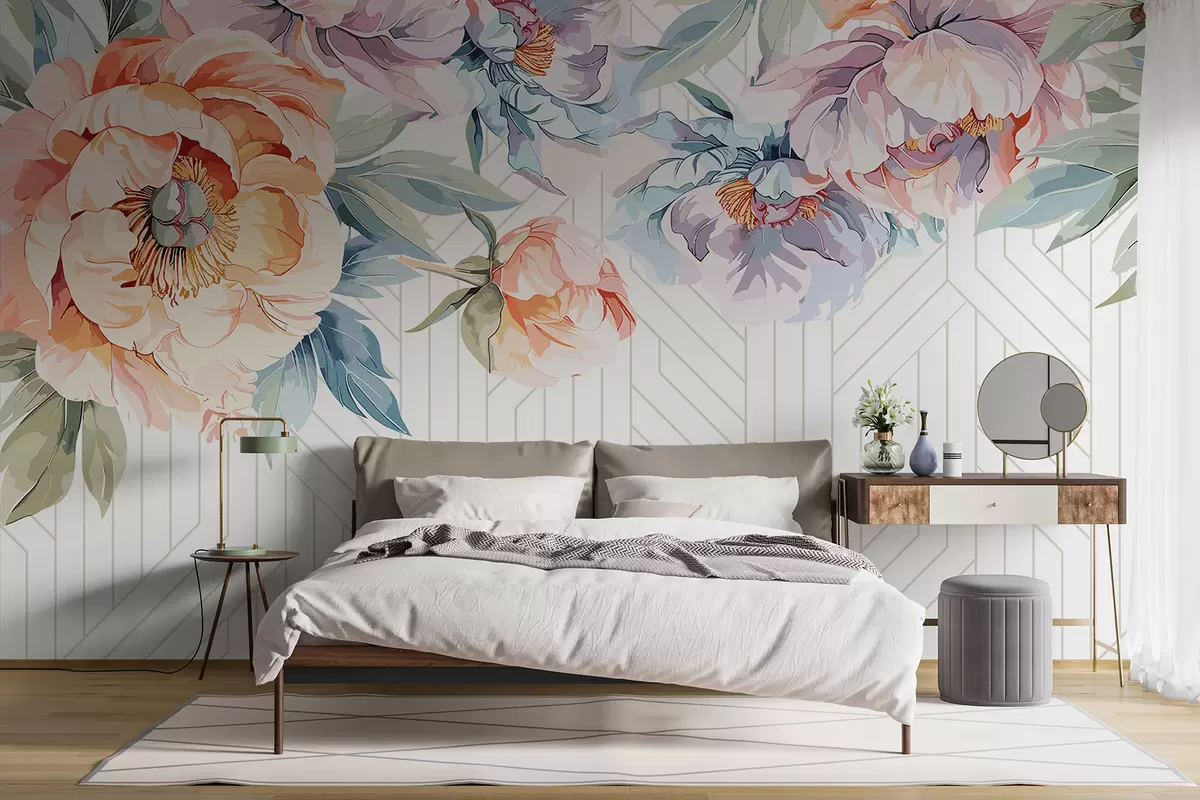 Fotomurales Peonías abstractas vibrantes de color melocotón y rosa con hojas verdes sobre un fondo con patrón blanco y gris Nr. w08183