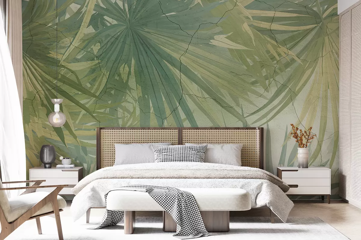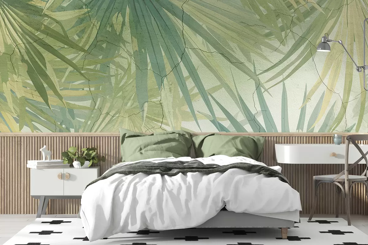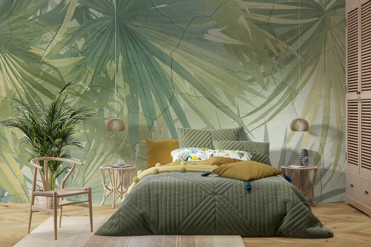 Fotomurales Follaje tropical exuberante con grandes hojas de palmeras verdes sobre un fondo suave y brumoso. Nr. w08187