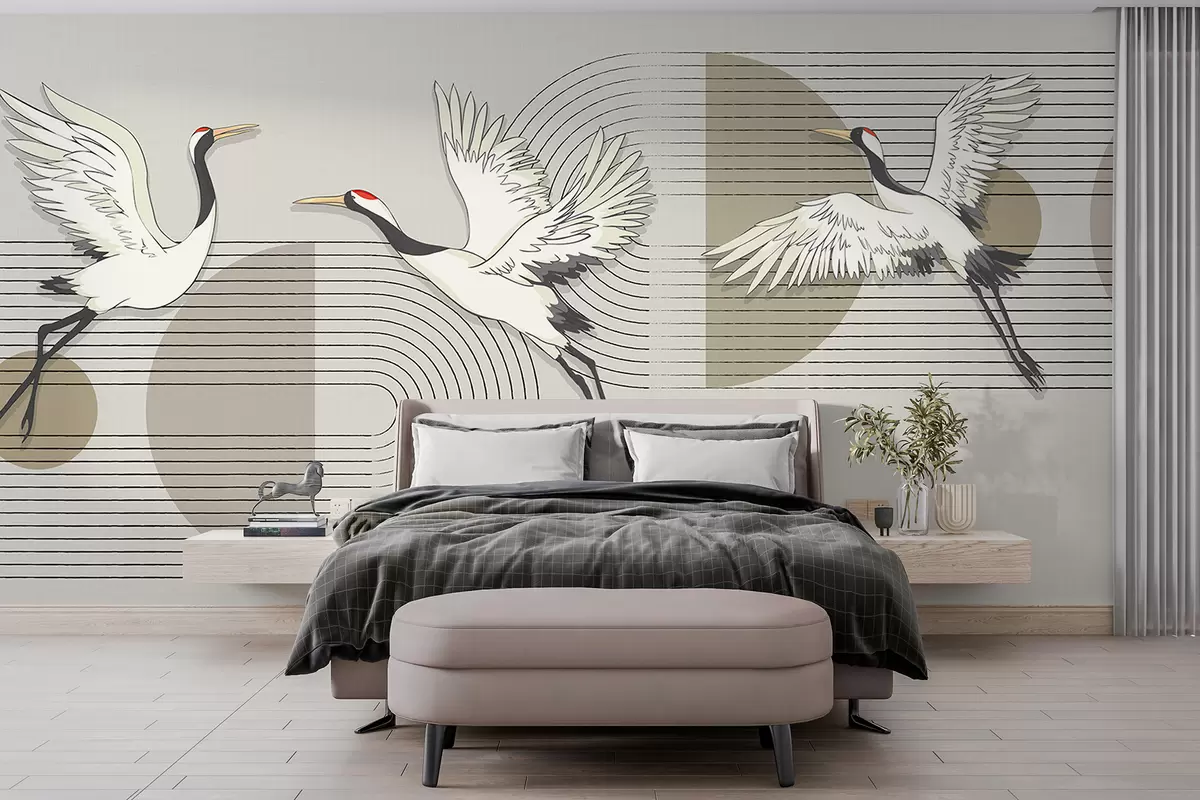 Fotomurales Tres grullas blancas en vuelo sobre un fondo geométrico minimalista con círculos concéntricos Nr. w08188