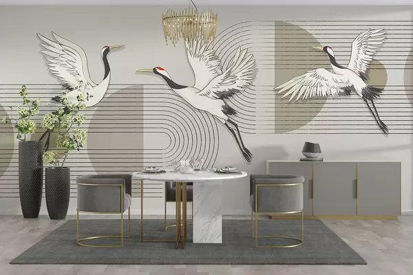 Fotomurales Tres grullas blancas en vuelo sobre un fondo geométrico minimalista con círculos concéntricos Nr. w08188