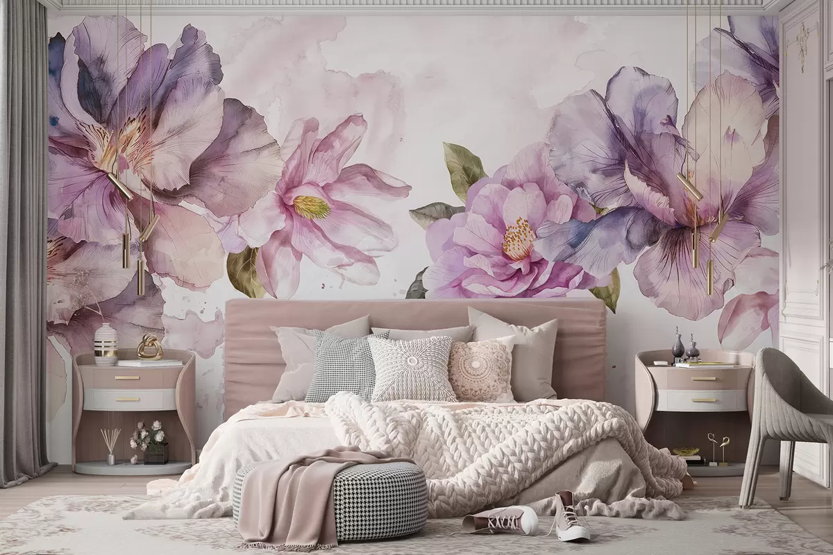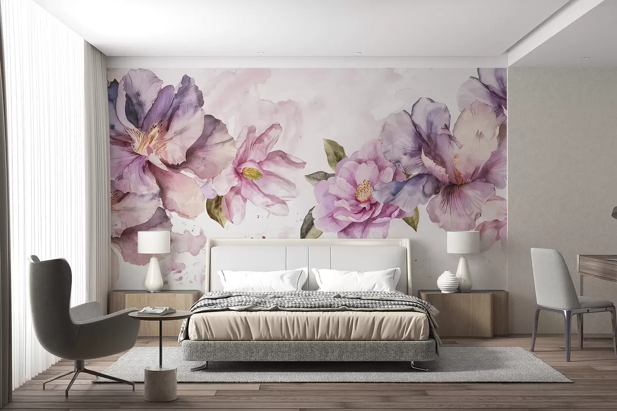 Fotomurales Delicadas flores de acuarela de color rosa y morado con pétalos suaves y hojas verdes sobre un fondo claro. Nr. w08238