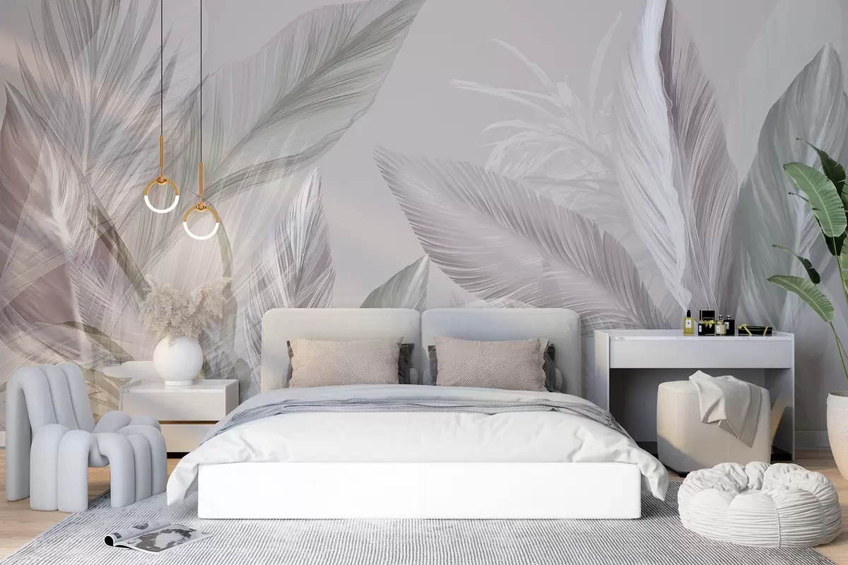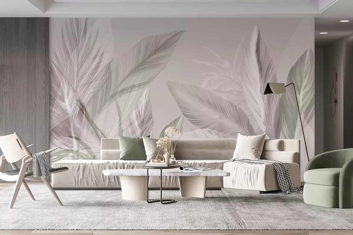 Fotomurales Plumas suaves de color blanco, rosa y gris y hojas tropicales flotando sobre un fondo claro. Nr. w08241v1