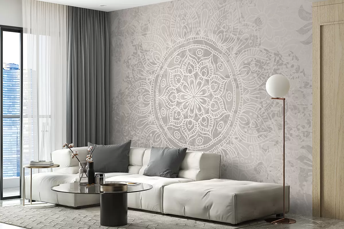 Fotomurales Un patrón de mandala blanco detallado sobre un fondo vintage texturizado de color gris claro. Nr. w08246