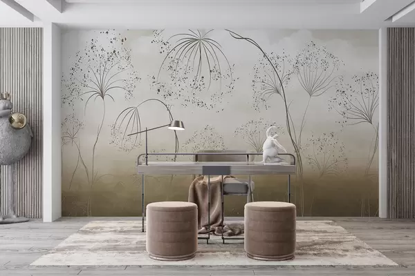 Fotomurales Plantas marrones, altas y tenues, con delicadas flores en forma de paraguas o cabezas de semillas en un entorno atmosférico y brumoso Nr. w08258