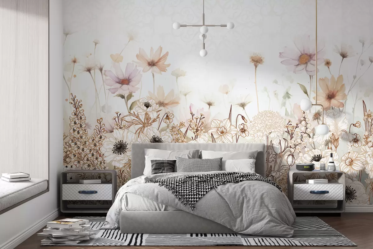 Fotomurales Un campo de flores y follaje blanco, beige y rosa sobre un fondo floral suave y difuminado Nr. w08259